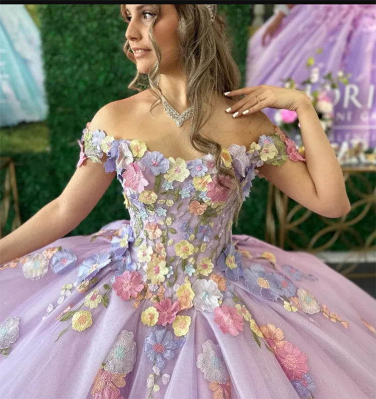 Vestido de quinceañera con hombros descubiertos, apliques de encaje mexicano y lavanda brillante