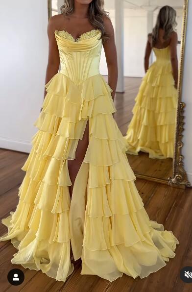 Vestidos de fiesta largos con corsé amarillo sexy con abertura en forma de corazón en capas, vestido de fiesta de graduación PS12133