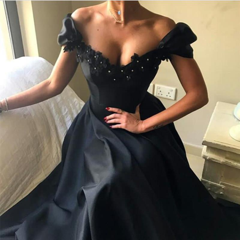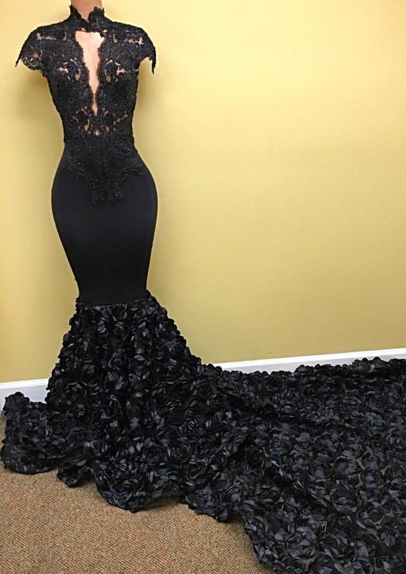 Siaoryne LP022 Increíble vestido de fiesta negro con mangas cortas y encaje con flores en la parte inferior y cola larga 2020