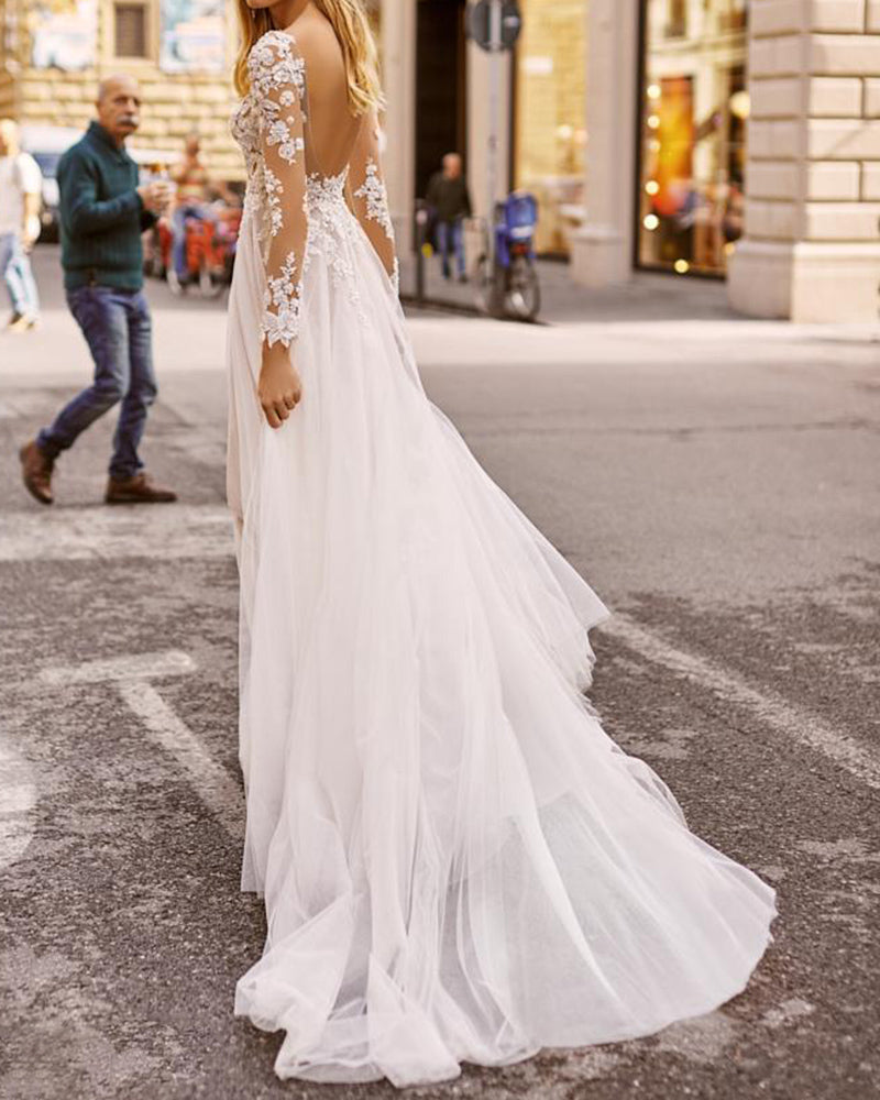 Vestido de novia de tul blanco personalizado de manga larga a precio económico con apliques de encaje y abertura alta en la pierna, Robe De Mariee WD0721