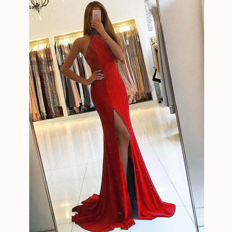 Vestido de fiesta elegante azul real 2022, vestido de noche ajustado con cuello halter, abertura sexy para niñas, fiesta de graduación LP5598