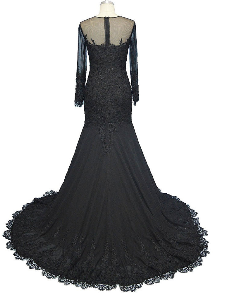 Vestido de noche elegante de sirena negro con mangas largas y encaje con cuentas para mujer