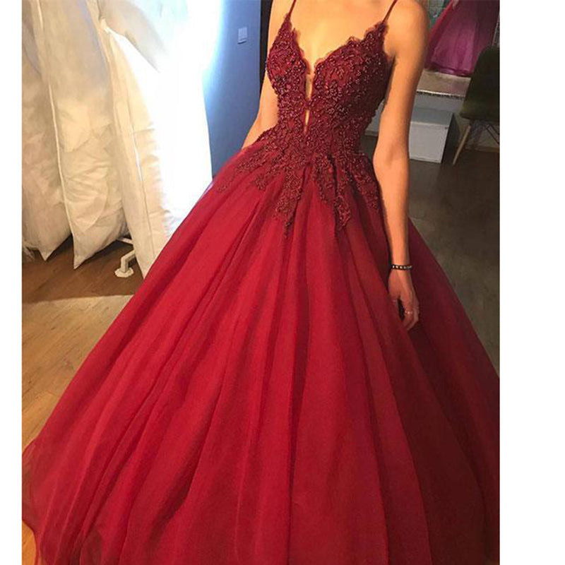 Vestidos de fiesta formales de noche con tirantes finos largos y elegantes en color burdeos 2020