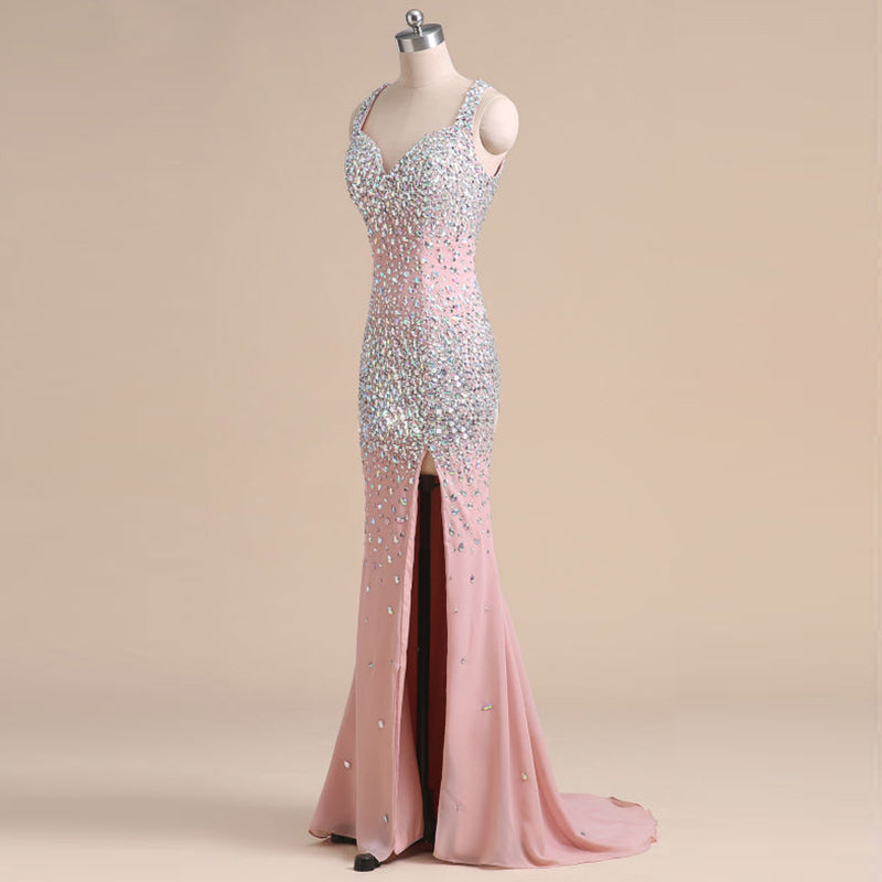 Vestidos de fiesta largos de sirena con abertura y cristales, vestido formal de noche para mujer con abalorios pesados