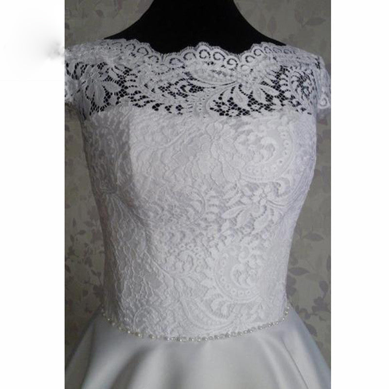 Vestidos de novia de corte A cortos de satén con encaje y mangas cortas hechos a medida, vestido de novia hasta la rodilla