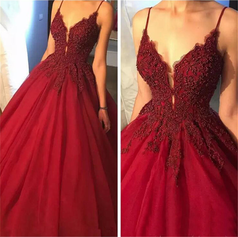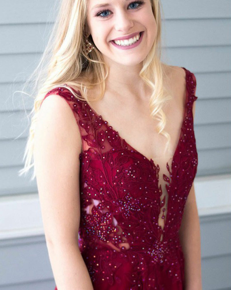 Vestido de noche largo de encaje rojo oscuro con escote en V y cuentas para fiesta de graduación