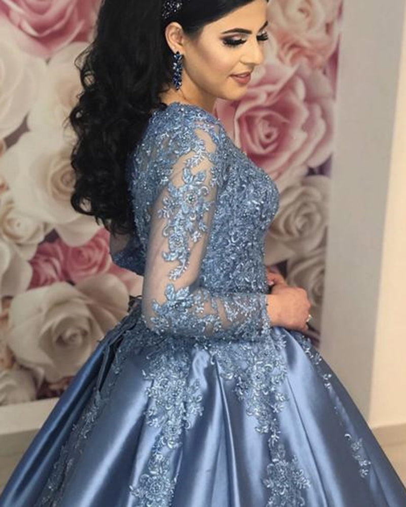 Vestido de novia azul polvoriento con encaje y manga larga para mujer, vestido formal de noche para fiesta de boda WD0616