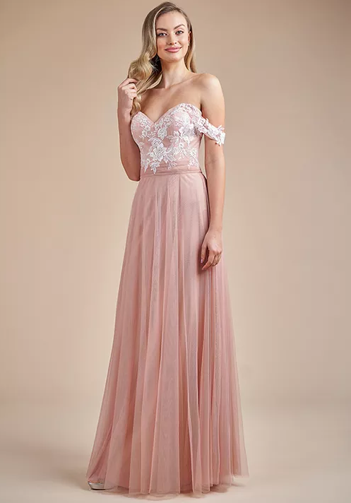 Vestido de noche formal largo con tirantes y apliques de tul color rosa polvoriento LP1202 2020