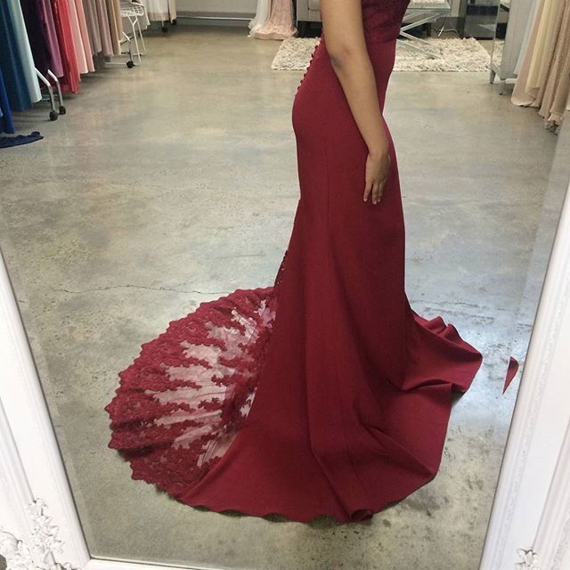 Elegante vestido de noche de sirena con encaje burdeos y hombros descubiertos, vestido largo de dama de honor para mujer con cola