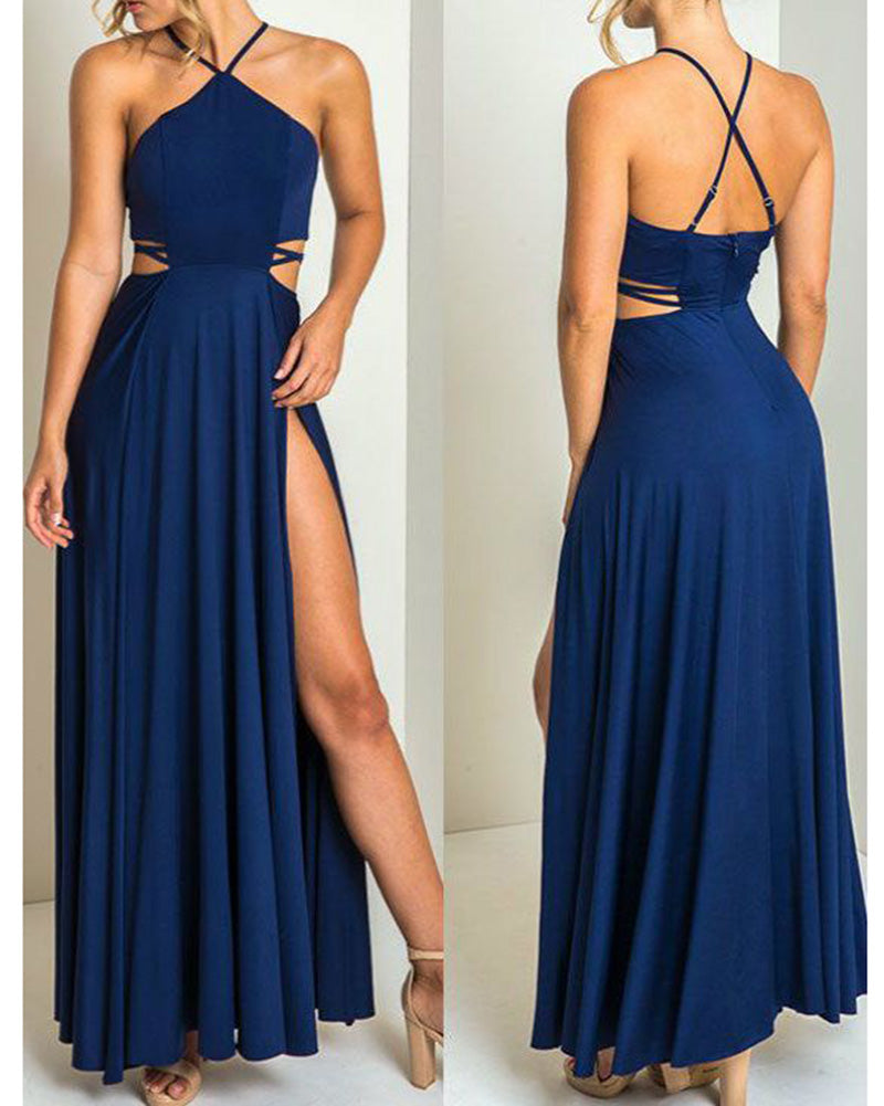 Elegante vestido de fiesta largo con escote halter y abertura alta en azul marino/burdeos PL302