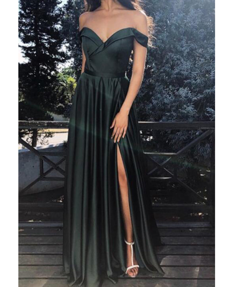 Elegante vestido de fiesta formal largo con hombros descubiertos de color verde oliva oscuro para mujer con abertura sexy LP0317
