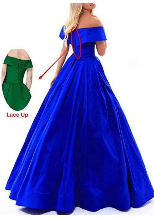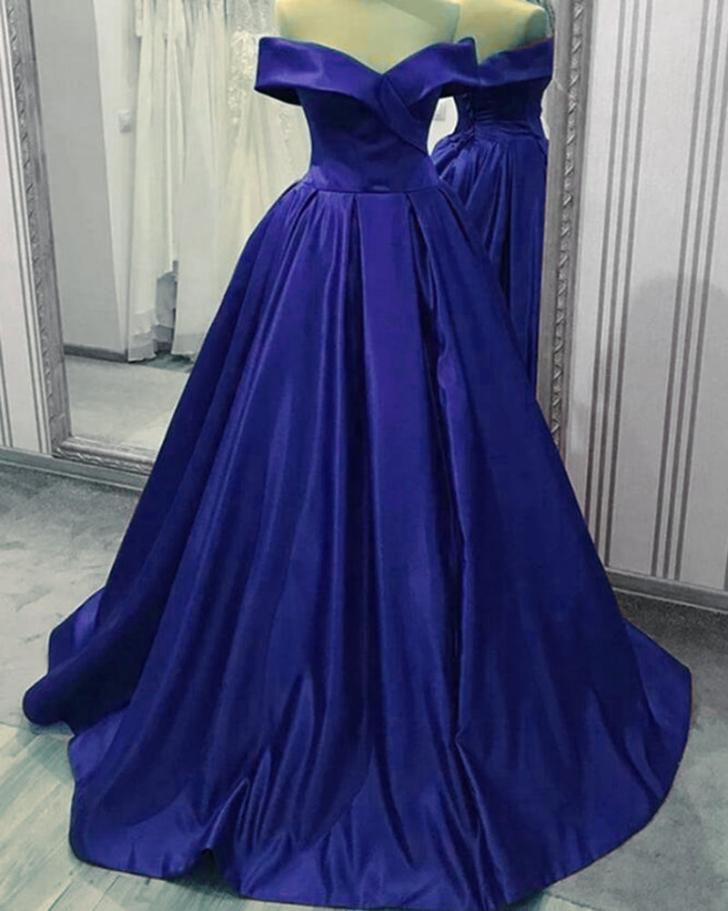 Elegante vestido de fiesta azul real largo de satén con hombros descubiertos y pierna dividida PL10103