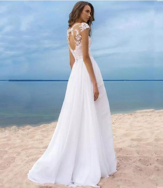 Elegante vestido de novia de encaje con escote redondo y mangas cortas para boda en la playa con aberturas, vestido de WD10271