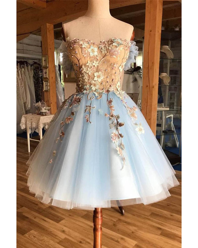 Vestido de fiesta corto azul claro con encaje dorado y hombros descubiertos de hada 2022 SP11015