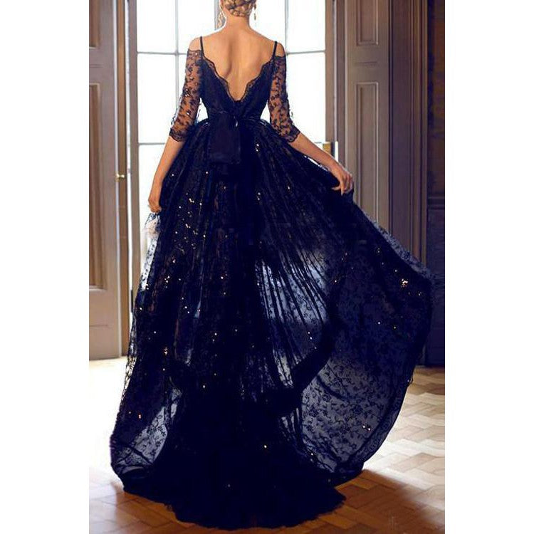 Vestido de noche 2022 de manga larga con encaje negro, vestido de fiesta alto bajo, sexy, sin espalda, vestidos de gala