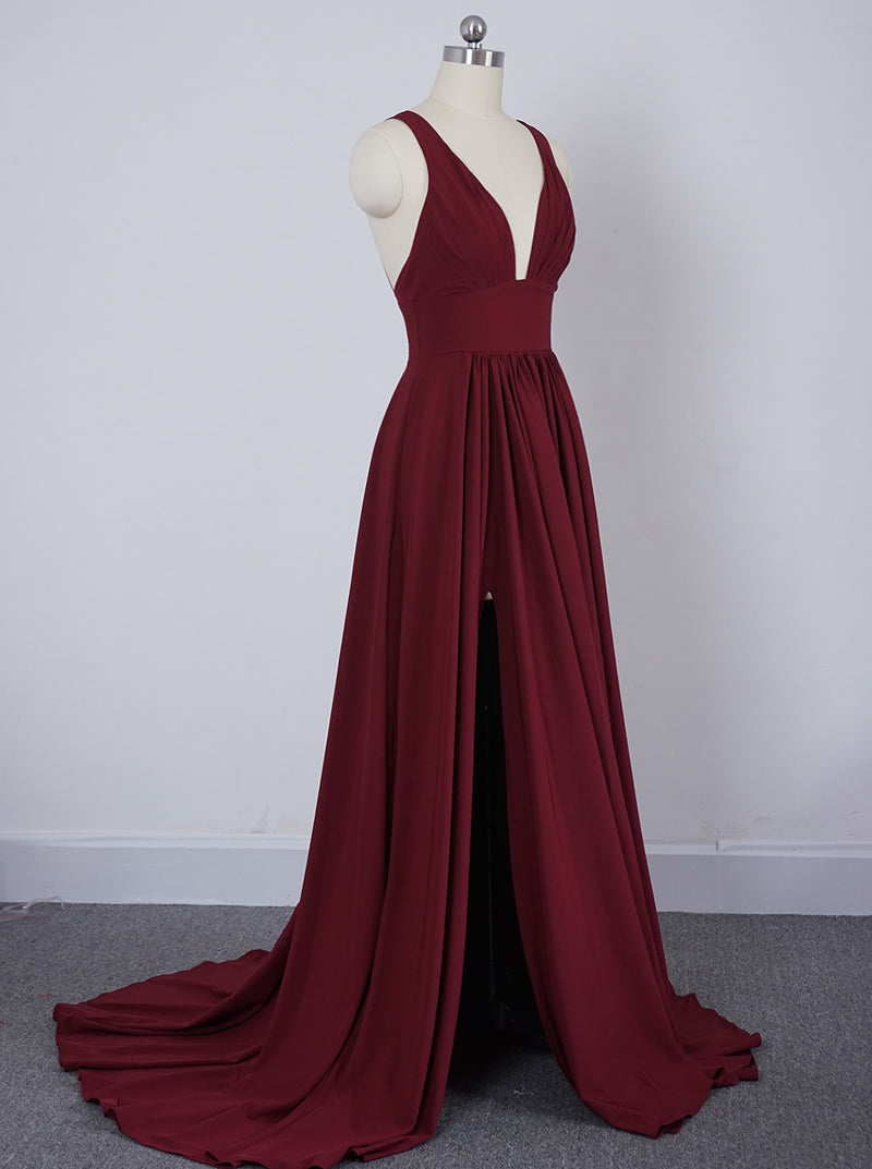 Vestidos de noche largos con abertura y escote en V sexy para mujer, vestido de dama de honor color granate LP0247