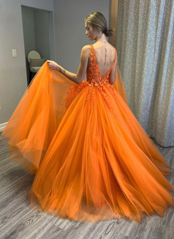 Vestido de fiesta largo de tul y encaje con escote en V color naranja quemado, vestido formal PL10162