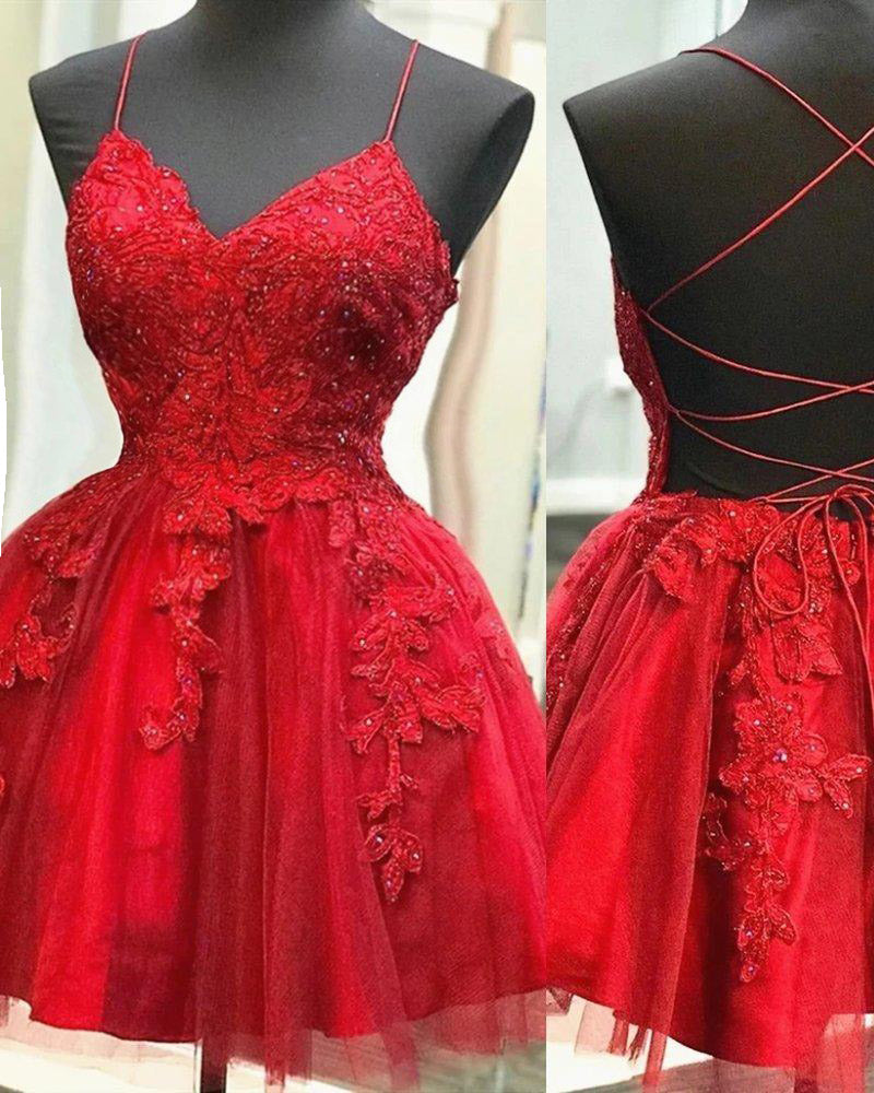 Vestidos de fiesta cortos de encaje rojo semi formales para niñas elegantes con tirantes SP11117