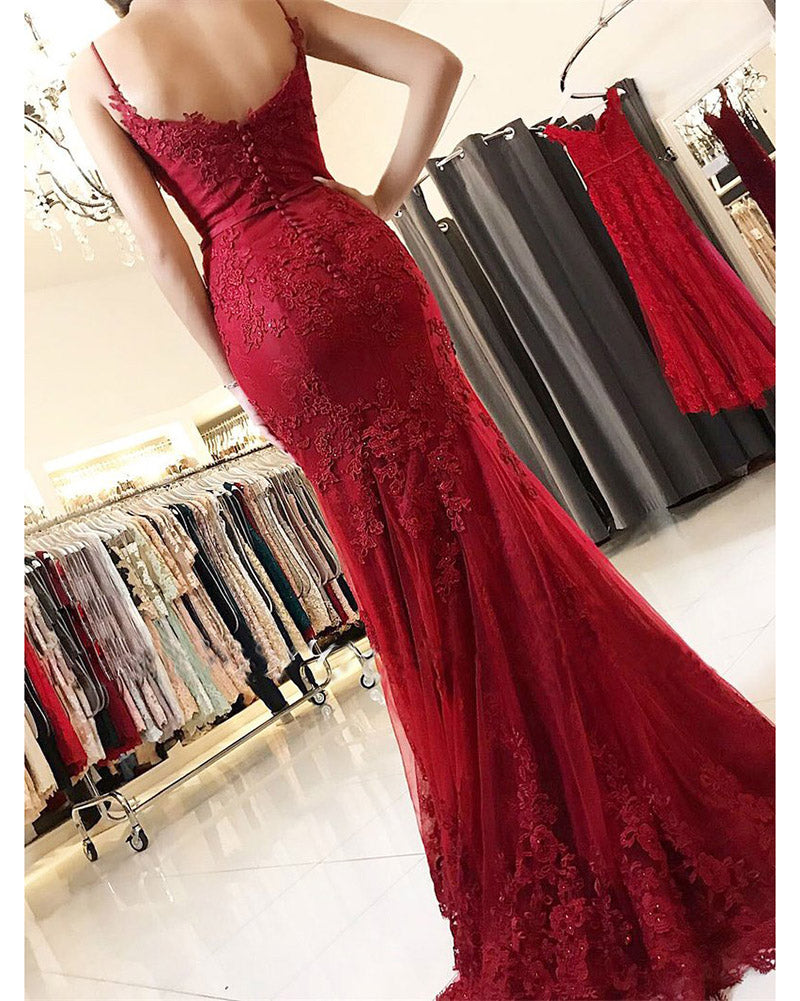 Vestidos de fiesta de encaje burdeos con tirantes finos y sirena de moda 2022 LP368