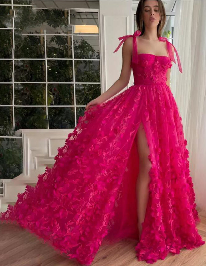 Vestidos de fiesta largos de color fucsia intenso y rosa para niñas con apliques de encaje PL12249