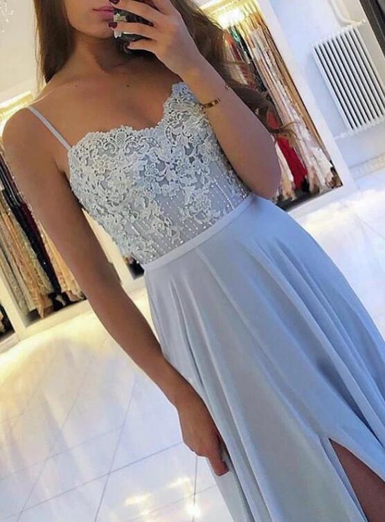 Vestido de fiesta largo de gasa con tirantes finos y apliques de encaje, vestido de fiesta azul PL06291
