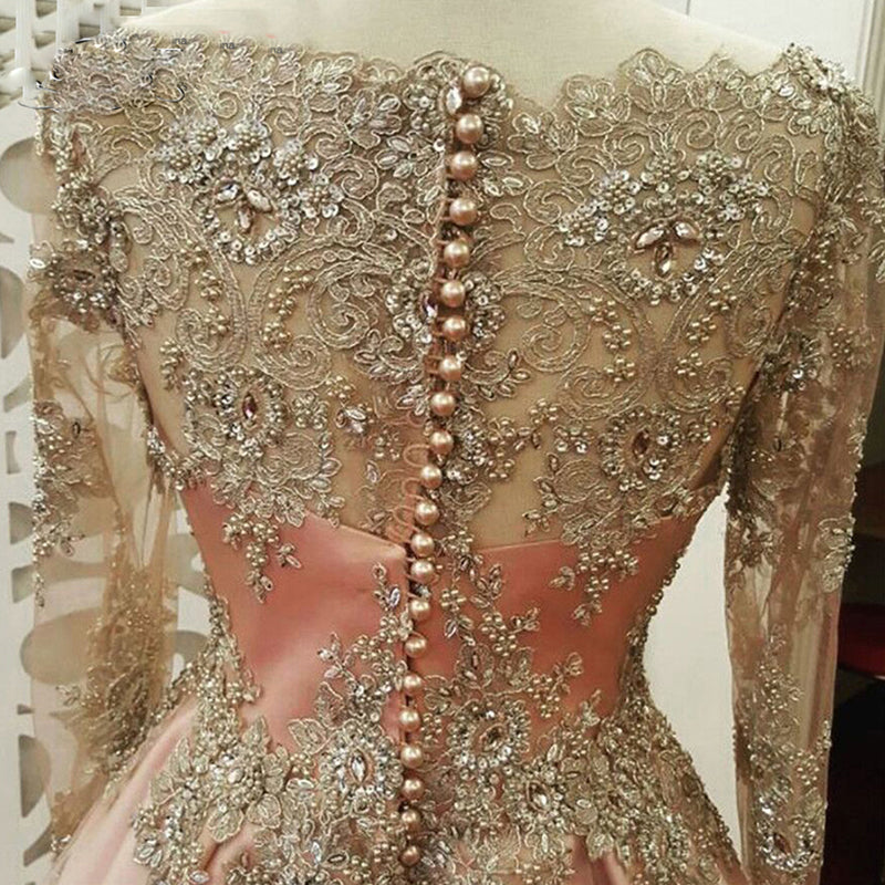 LP4456 Vestido de noche formal de manga larga musulmán vintage para mujer Vestido de fiesta largo con apliques de encaje dorado