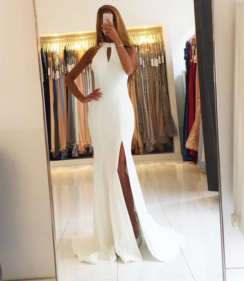 Nuevos vestidos de fiesta blancos con cuello halter 2018, vestidos de fiesta largos de noche ajustados con abertura sexy, vestido de formatura