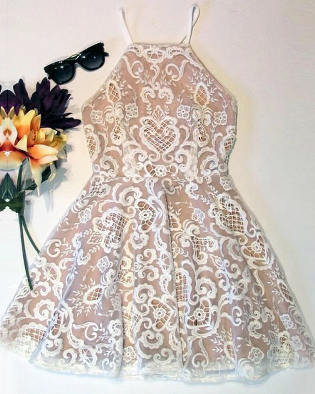 Vestido corto de fiesta con escote halter en color marfil/desnudo, vestido de cóctel corto semiformal con espalda cruzada