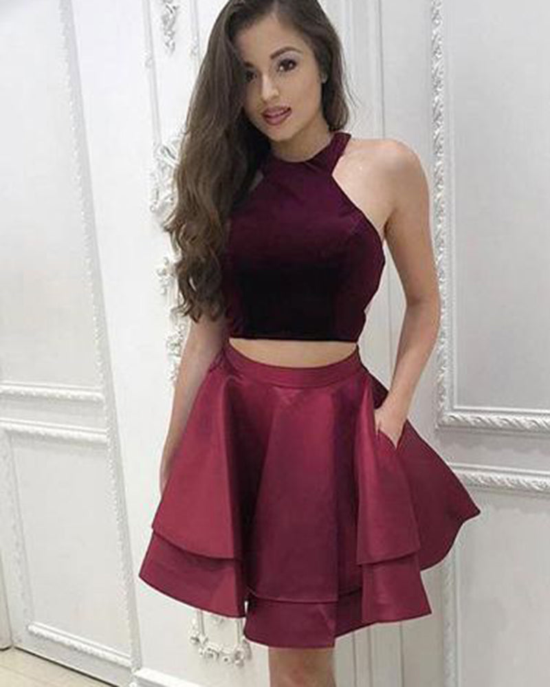 Vestido corto de fiesta de noche con cuello halter, color vino y rojo oscuro, para niñas