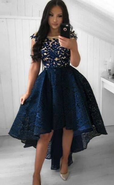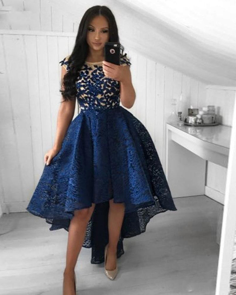 Vestido de fiesta corto de encaje con parte delantera alta y baja, espalda larga y corta, azul marino, para niña SP102231