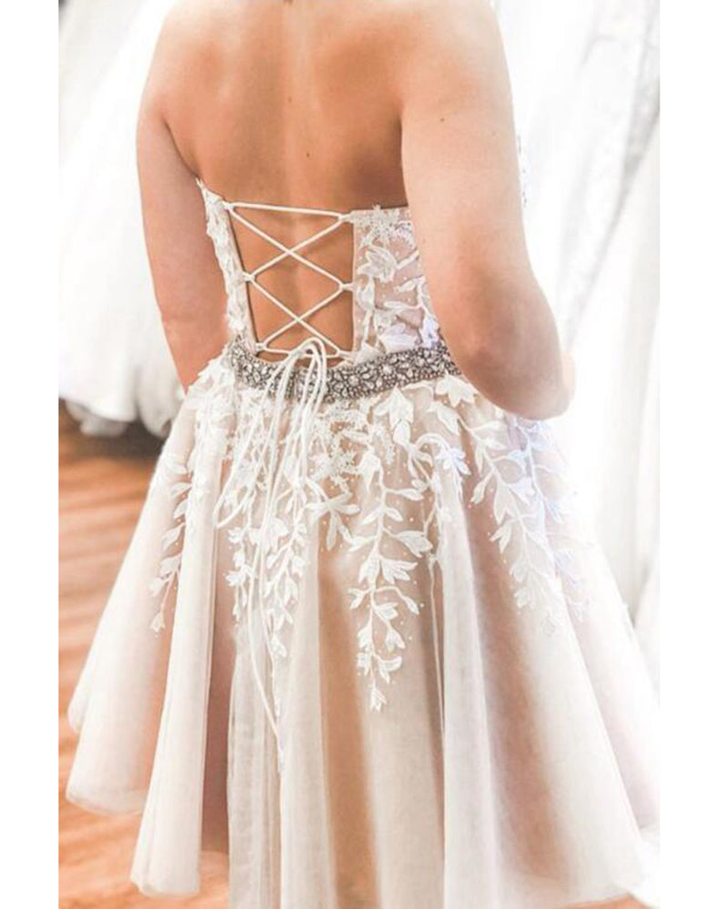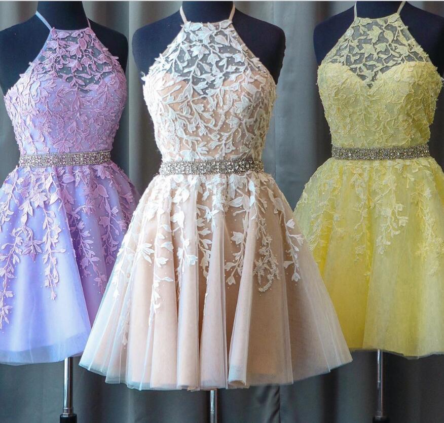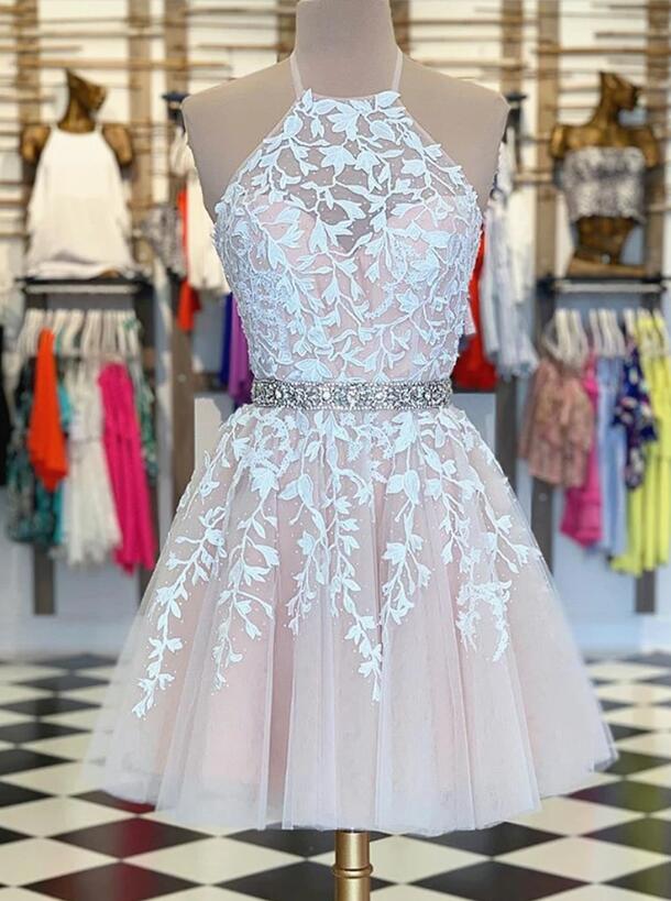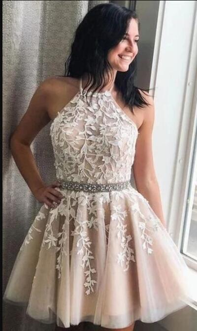 Vestido de fiesta corto con cuello halter y encaje color marfil/desnudo, vestido de cóctel para niñas pequeñas SP0804