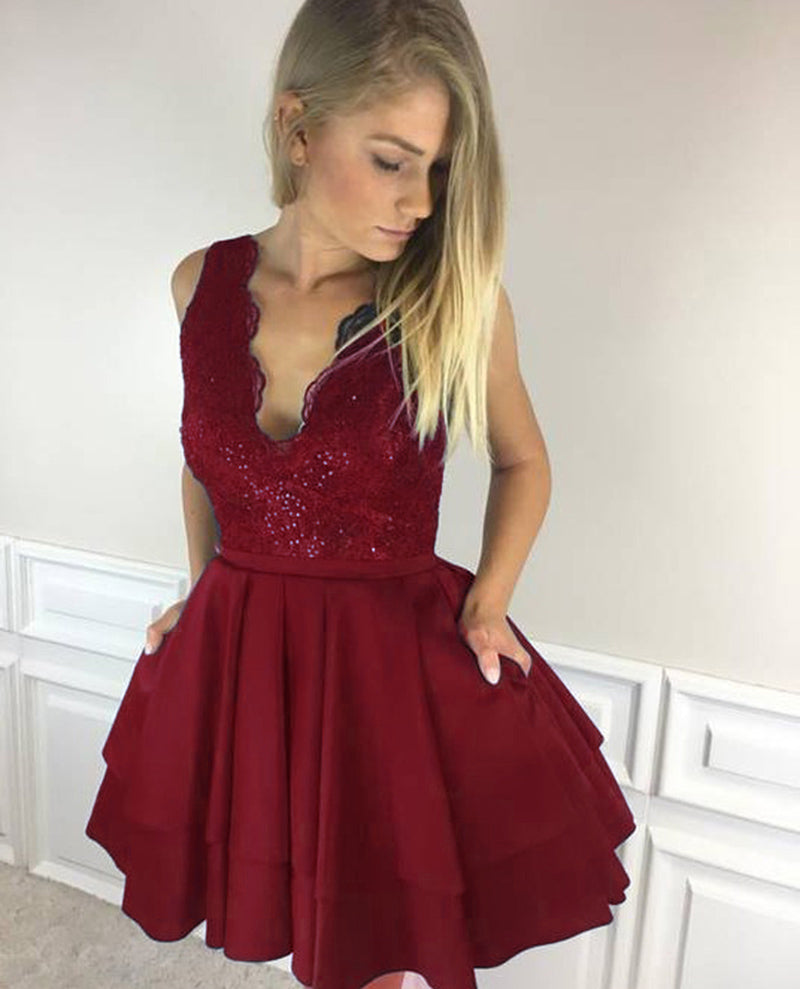 Vestido corto de cóctel para niñas, de encaje, con escote en V, color azul marino, para fiesta de graduación y graduación SP0905