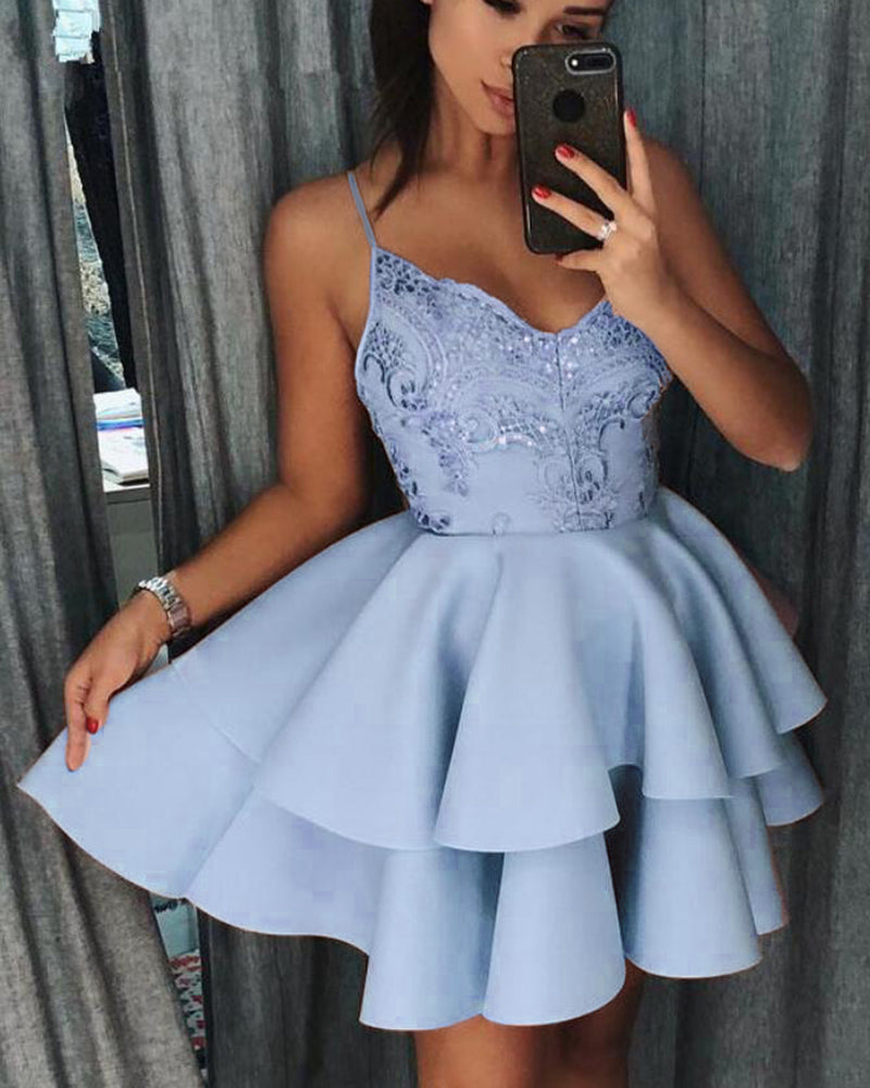 Vestido de fiesta corto azul cielo con escote halter y tirantes finos, vestido corto SP0923
