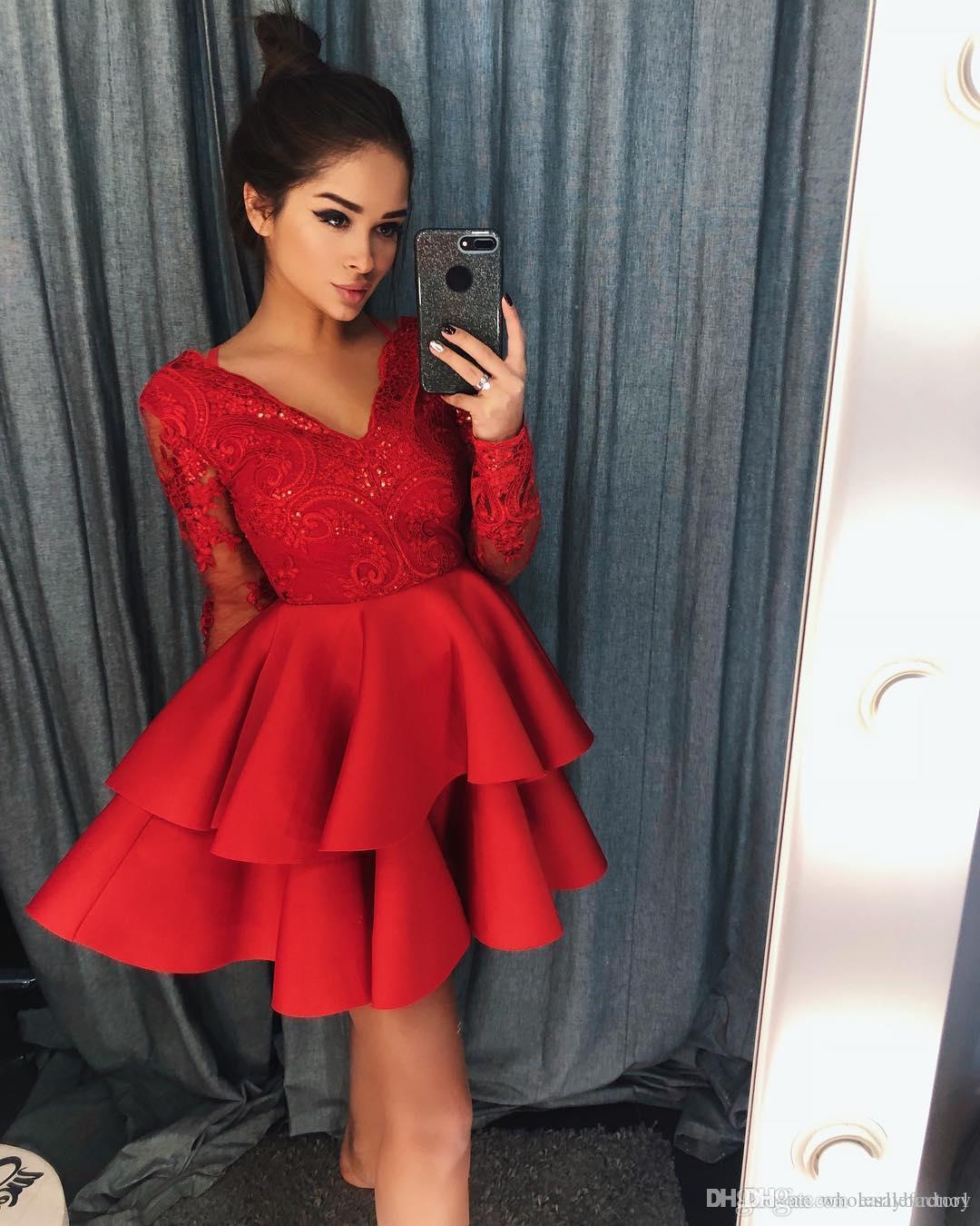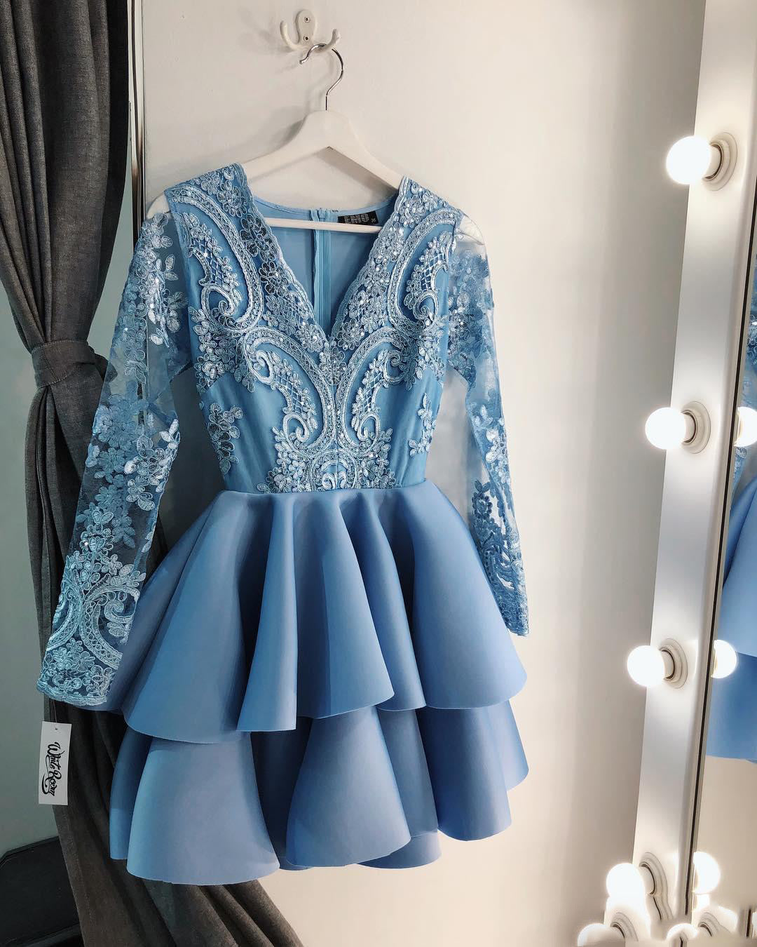 Vestido corto de satén con escote en V y mangas largas en color azul para fiesta de graduación, vestido corto para niñas para la fiesta de bienvenida SP0816