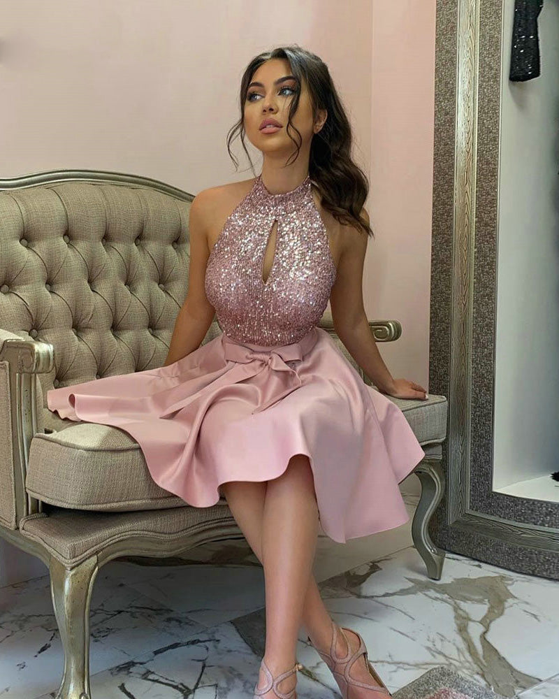 Vestido corto de fiesta con cuello halter y lentejuelas de color rosa empolvado para niñas Vestido corto de fiesta de graduación SP0929