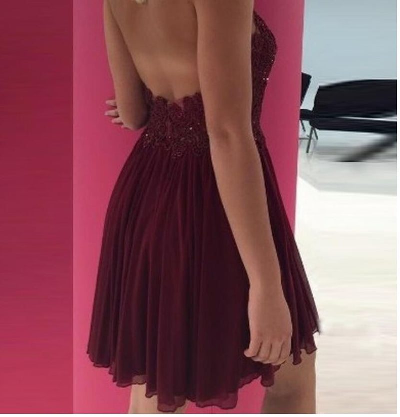 Vestido corto de fiesta de graduación para niñas, color rojo oscuro, con cuello alto y escote halter