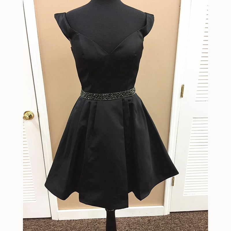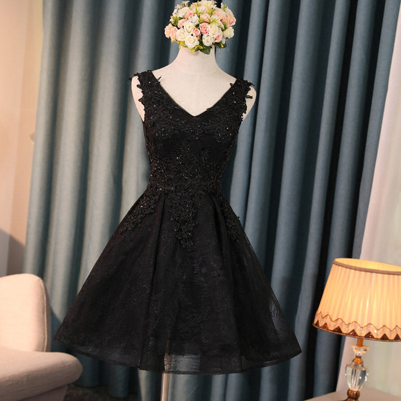Vestido de cóctel semiformal negro sencillo con escote en V, corto, para fiesta de graduación y regreso a casa