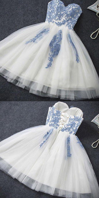 SP547 Vestido de fiesta corto elegante de encaje marfil y azul, vestido de cóctel, vestido de fiesta semiformal