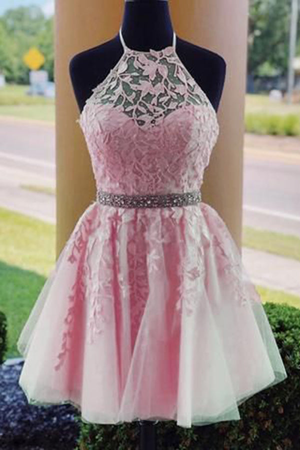 Vestido de fiesta de bienvenida de color rosa ruborizado con encaje halter, vestido de cóctel semiformal con cuentas, SP07284