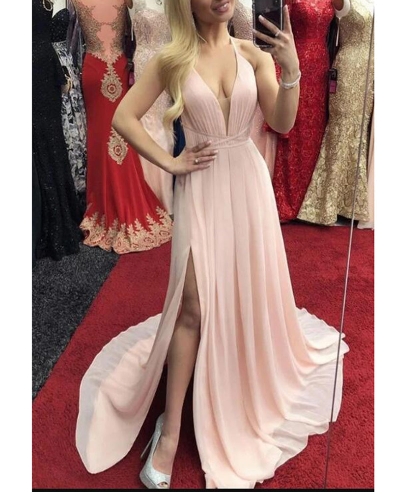 Vestidos de fiesta de noche de gasa largos con escote en V sexy de color rosa ruborizado y abertura 2020