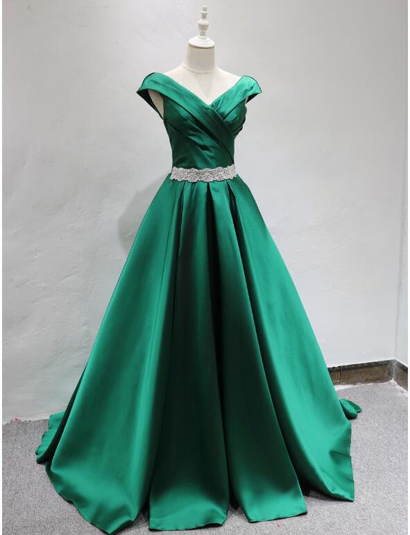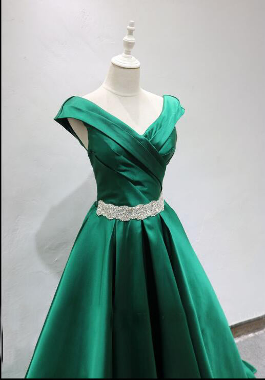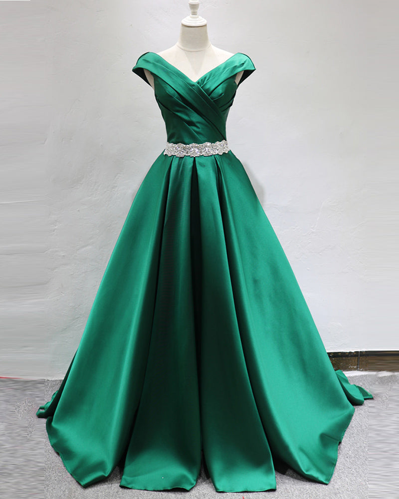 Vestido de fiesta largo de satén verde con corte en A y cinturón LP654