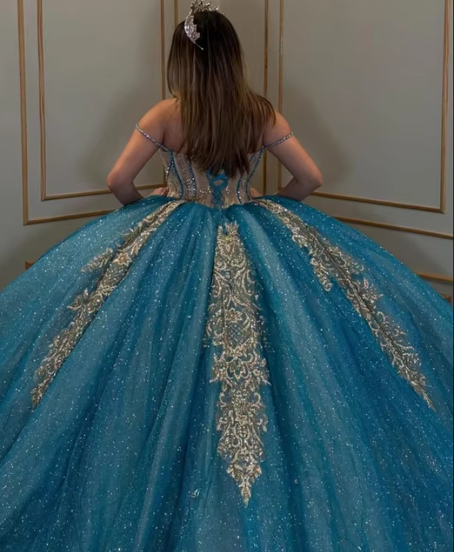 Off the Shoulder Blue Ball Gown Quinceneara Dress Gold Appliques Corest Birthday Party Dresses Vestidos De15 Anos Vestido Customized PL11052