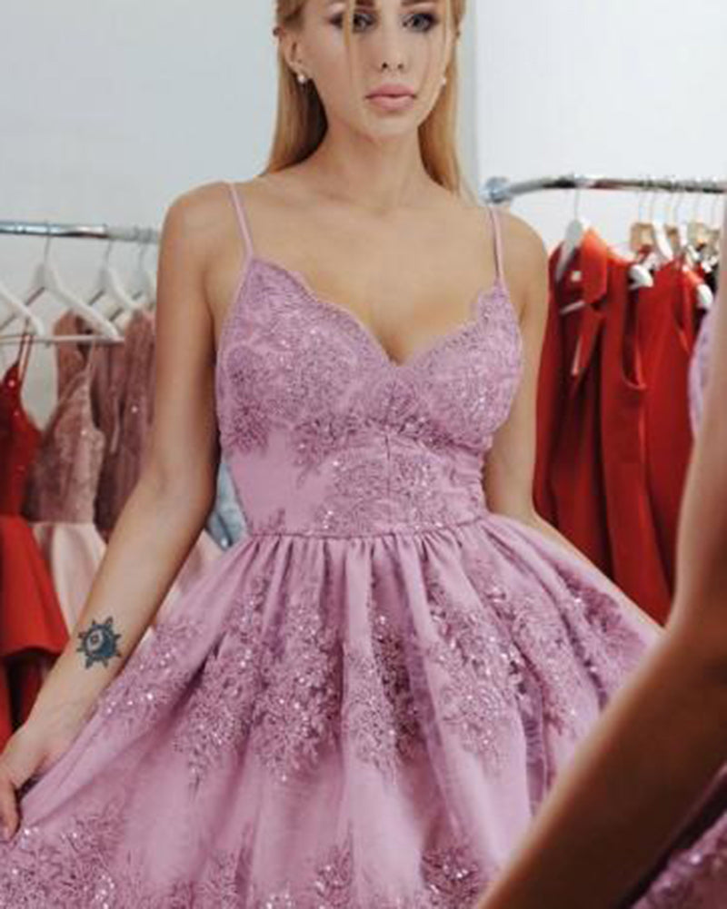 Vestido corto de encaje rosa dulce para la fiesta de bienvenida con tirantes SP322