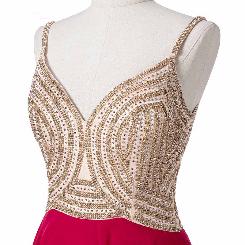 Robe de soirée longue rouge à perles avec bretelles en mousseline de soie pour femme 2018