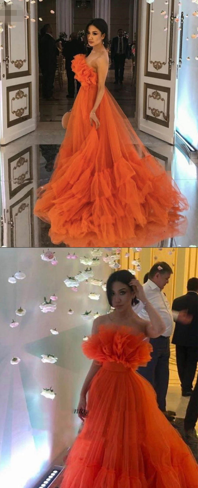 Robe de bal orange à volants en tulle sans bretelles et à plusieurs niveaux, robe de soirée trapèze pour occasions spéciales PL10624