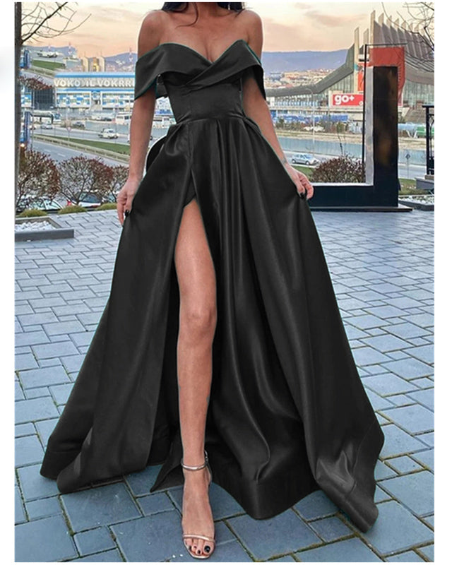Robe de soirée longue sexy en satin vert émeraude à épaules dénudées avec fente