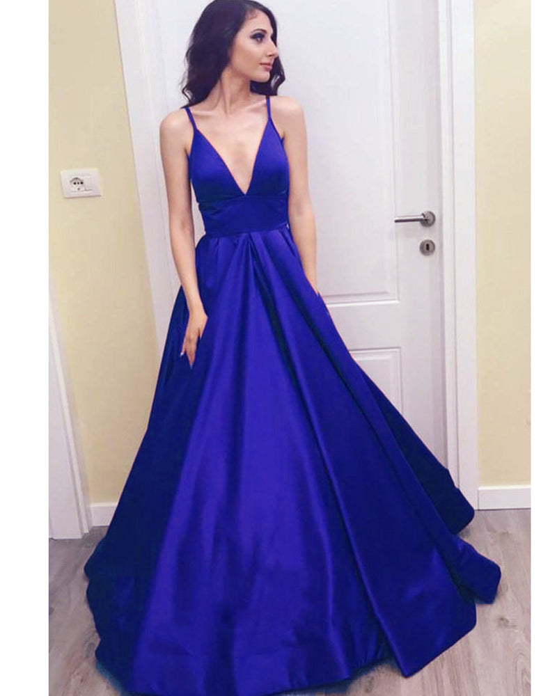 Robe longue de bal en satin bleu royal à bretelles spaghetti Siaoryne PL5014 2022
