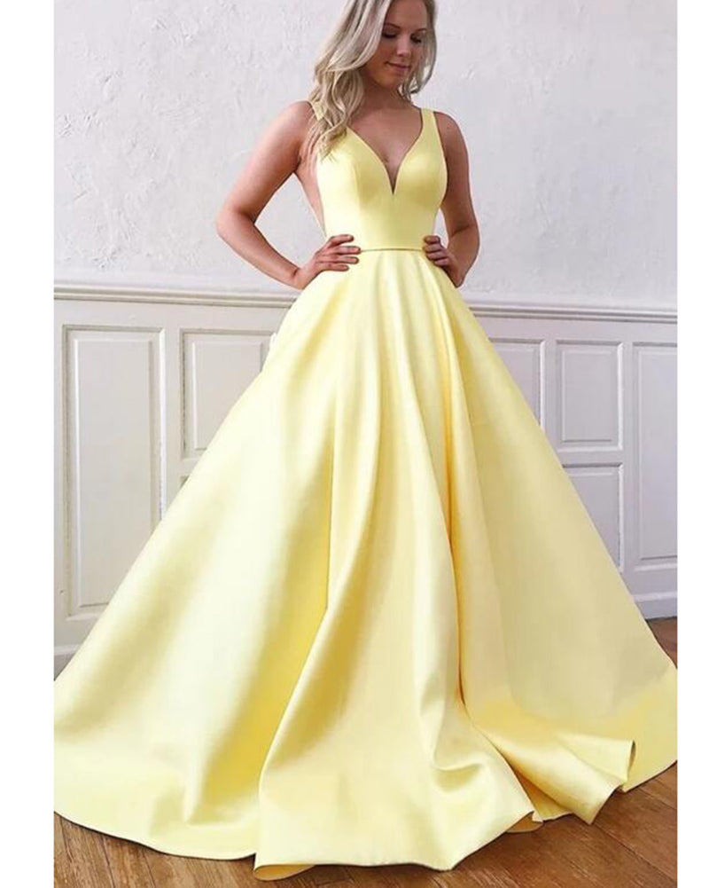 Robe de bal de fin d'année en satin jaune longue à col en V profond pour filles, coupe A-line, 2022 PL03311