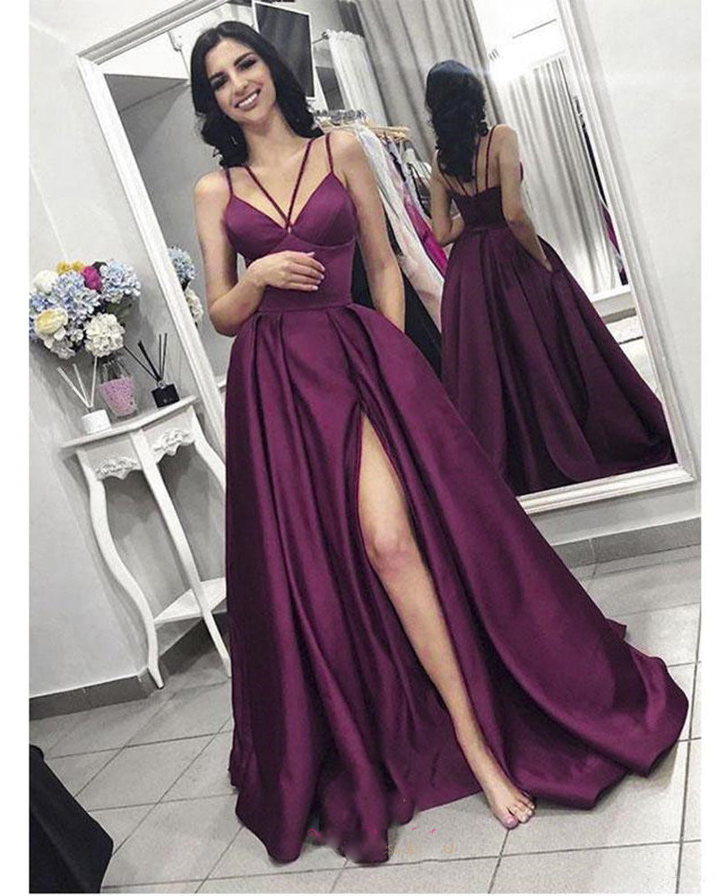 Robe de bal violette avec décolleté en V profond, robe de soirée longue en satin, ligne A, PL3650