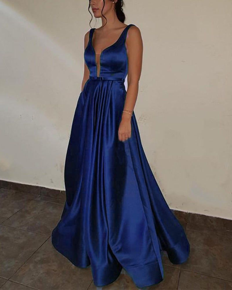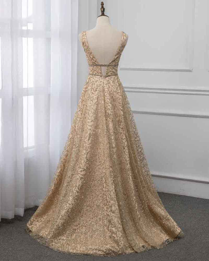 Robe de soirée longue à col en V et perles avec dos ouvert